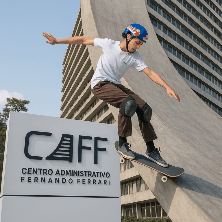 Skatista vai descer a rampa do CAFF em Porto Alegre durante evento da Red Bull em setembro