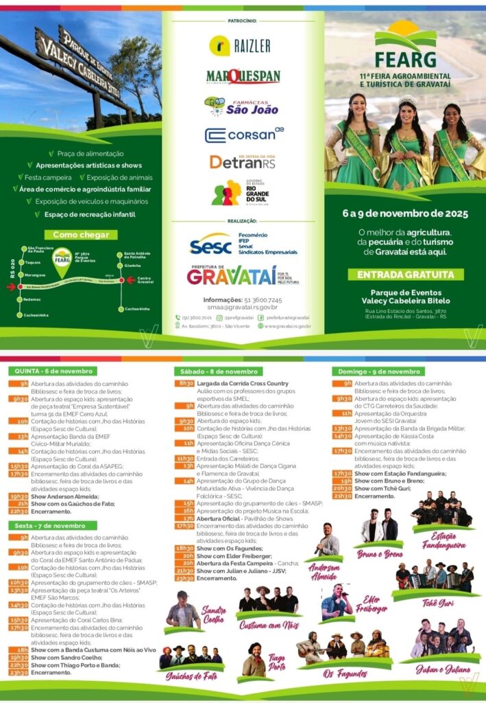 A 11ª edição da Feira Agroambiental e Turística de Gravataí (Fearg) será realizada de 6 a 9 de novembro, no Parque de Eventos Valecy Cabeleira Bitelo, localizado na Estrada Etamar Osmério Soares, 3870. O evento contará com entrada gratuita e programação que integra cultura, música, educação, atividades de lazer, vivências com escolas, apresentações artísticas e atrações do tradicionalismo gaúcho.